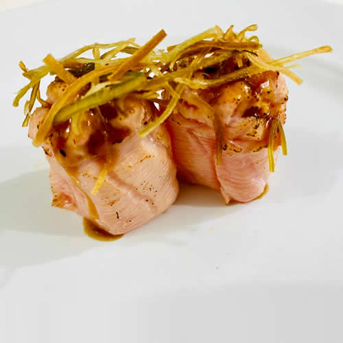 Bolinho de arroz envolto de salmão selado, coberto de molho de ostra e alho poró.