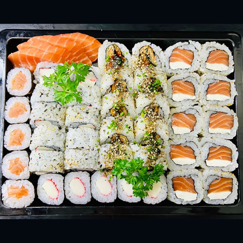 4 sashimi salmão; 10 uramaki salmão fila; 10 uramaki skin fila; 10 uramaki kani fila; 5 hossomaki