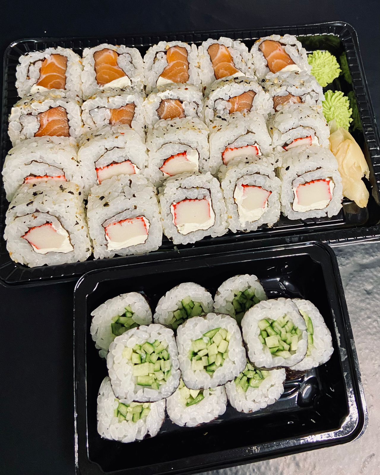 10 Uramaki salmão fila; 10 uramaki kani; 10 hossomaki pepino; 10 hot fila