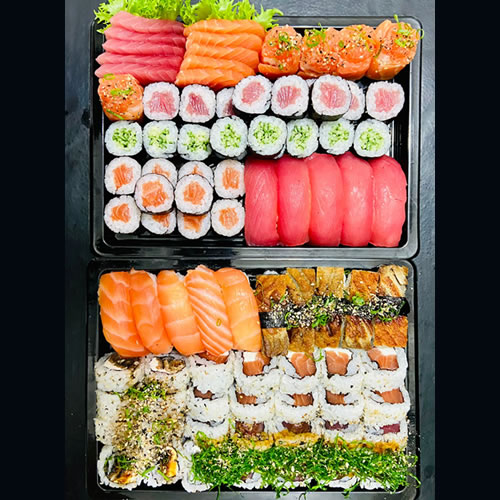 10 uramaki salmão filadélfia; 10 uramaki atum filadélfia; 10 uramaki skin filadélfia; 5 niguiri skin; 5