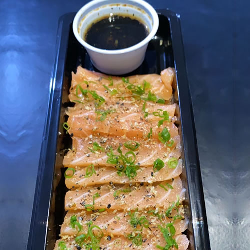 12 lâminas de salmão, acompanhadas de uma porção de molho ponzu especial da casa
