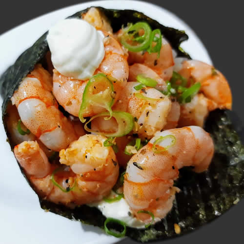 Alga, arroz, cream cheese, camarão cozido, cebolinha e gergilim.
