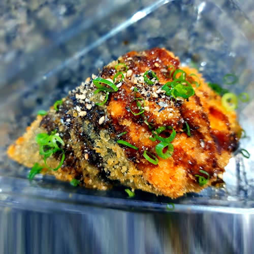 Alga, arroz, cream cheese, salmão e cebolinha. Empanado e frito.