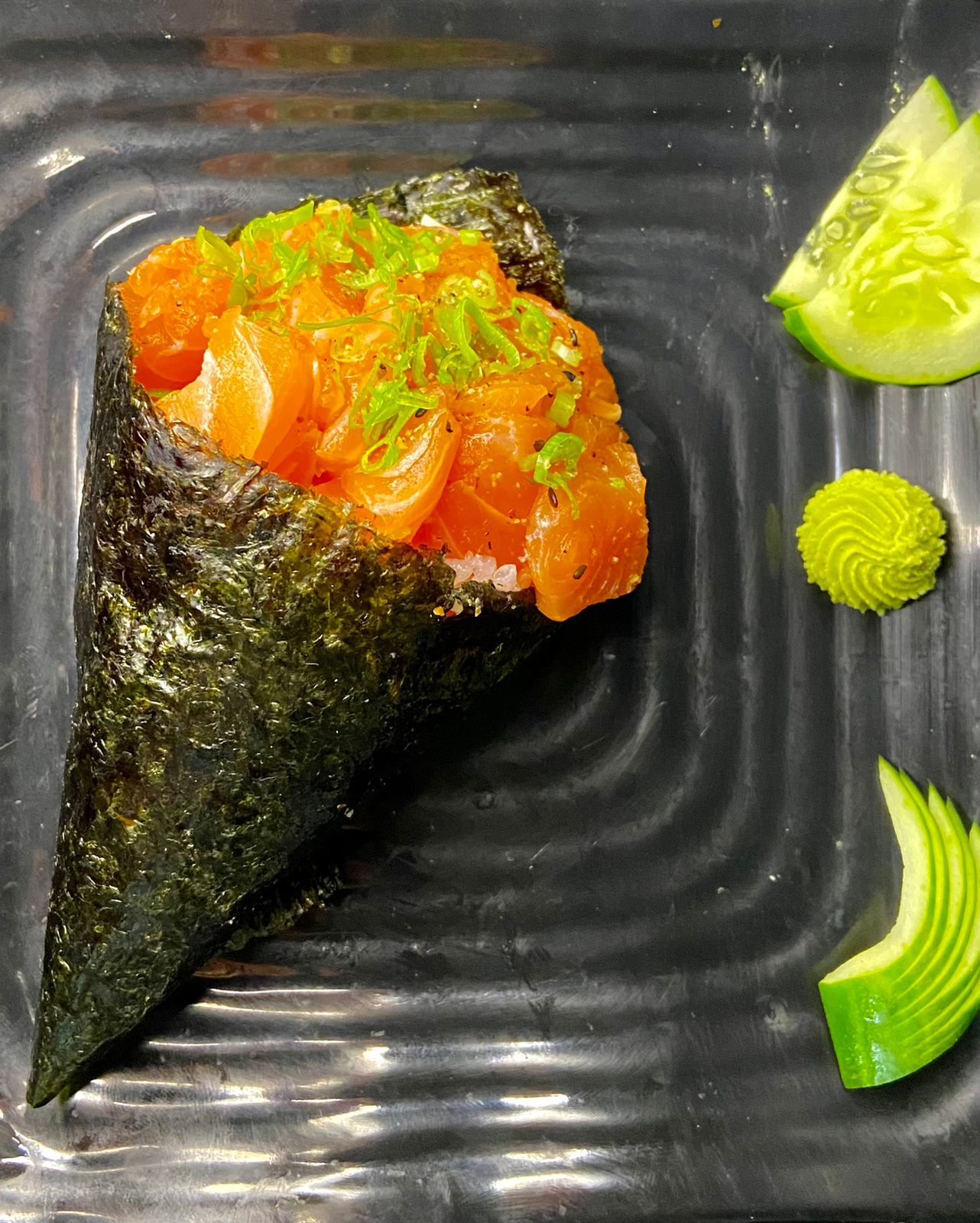 Alga, salmão e cebolinha.